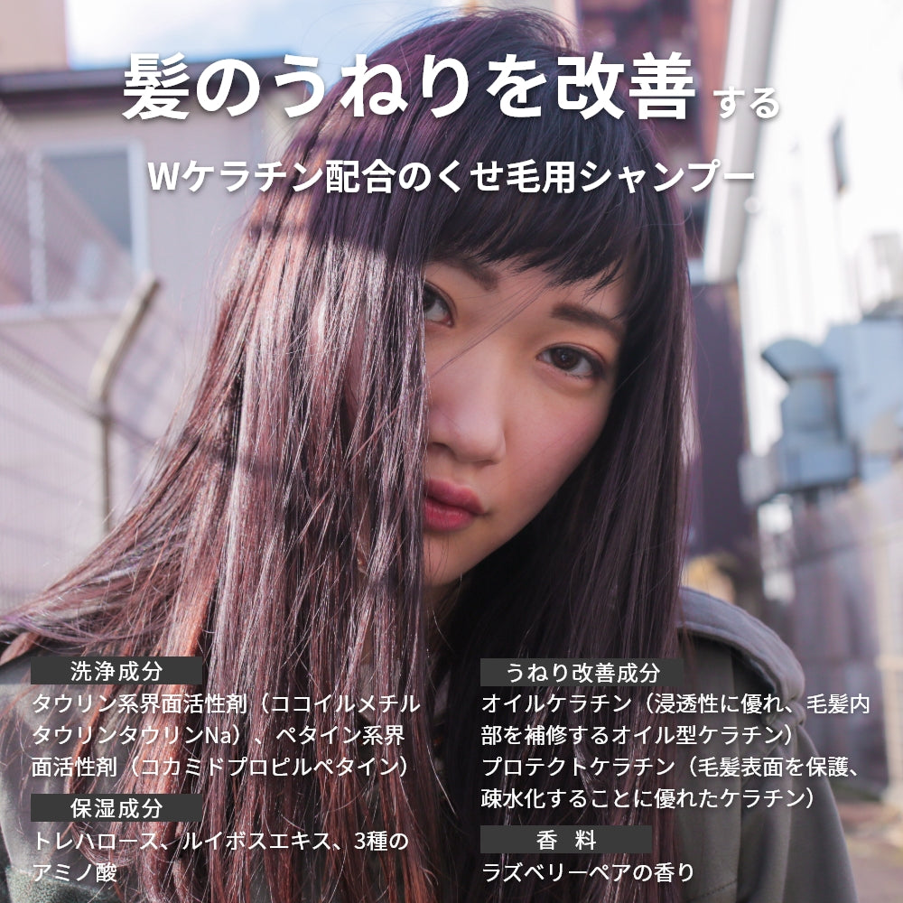 オイルケラチンCMCで毛髪内部の空洞を埋め、適度な水分調整を行い、プロテクトケラチン/18-MEAで毛髪外部を保護し、表面を疎水化することにより、うねりにくくて艶のある髪を保ちます。