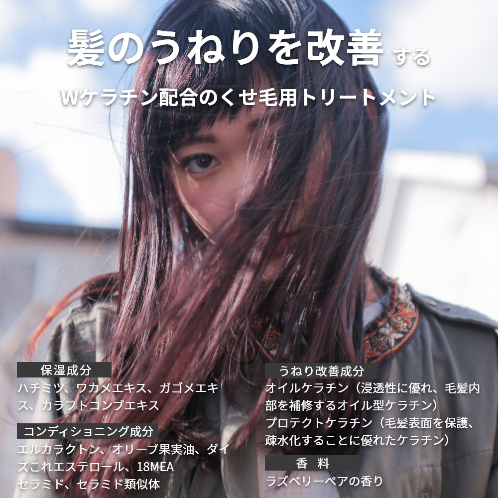 オイルケラチンCMCで毛髪内部の空洞を埋め、適度な水分調整を行い、プロテクトケラチン/18-MEAで毛髪外部を保護し、表面を疎水化することにより、うねりにくくて艶のある髪を保ちます。