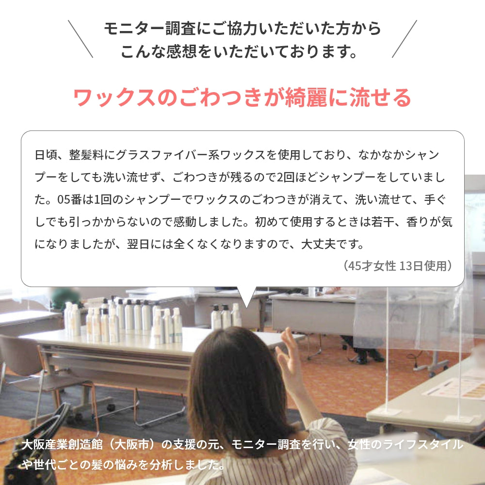 モニター様より、「チリチリ毛の縮毛が手で触っても気にならない程度におさまった」「髪の広がりが治ってまとまるようになった」「ワックスのごわつきが綺麗に流せる」とご意見頂きました。